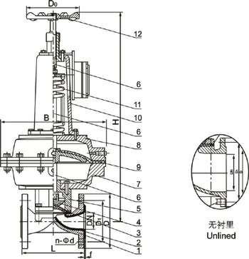 部件列表:1、阀体 2、阀体衬里 3、隔膜 4、阀瓣 5、下阀杆 6、阀盖 7、气缸 8、活塞 9、弹簧 10、气缸盖 11、上阀杆 12、手轮